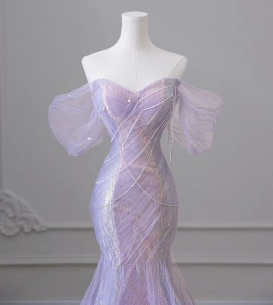 شما میتوانید با پوشیدن یک لباس مخمل ارغوانی که دارای طرح پری دریایی است، کانون توجه باشید. سایه بنفش تیره تجمل را تراوش میکند، و طراحی آن جلوهای جذاب و سلطنتی ایجاد میکند. استایل خود را با گوشوارههای تیفانی و موهای دم اسبی تکمیل کنید.