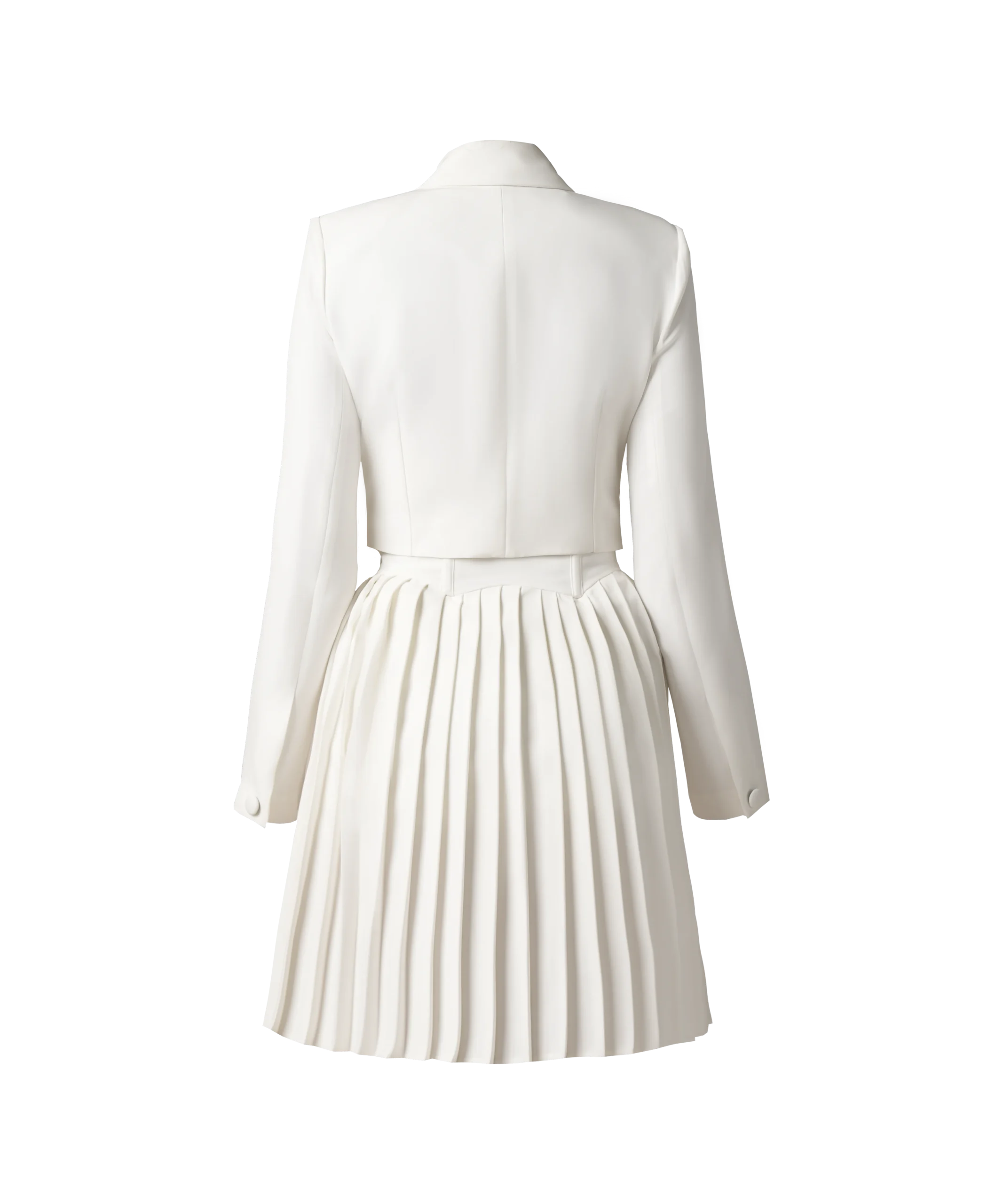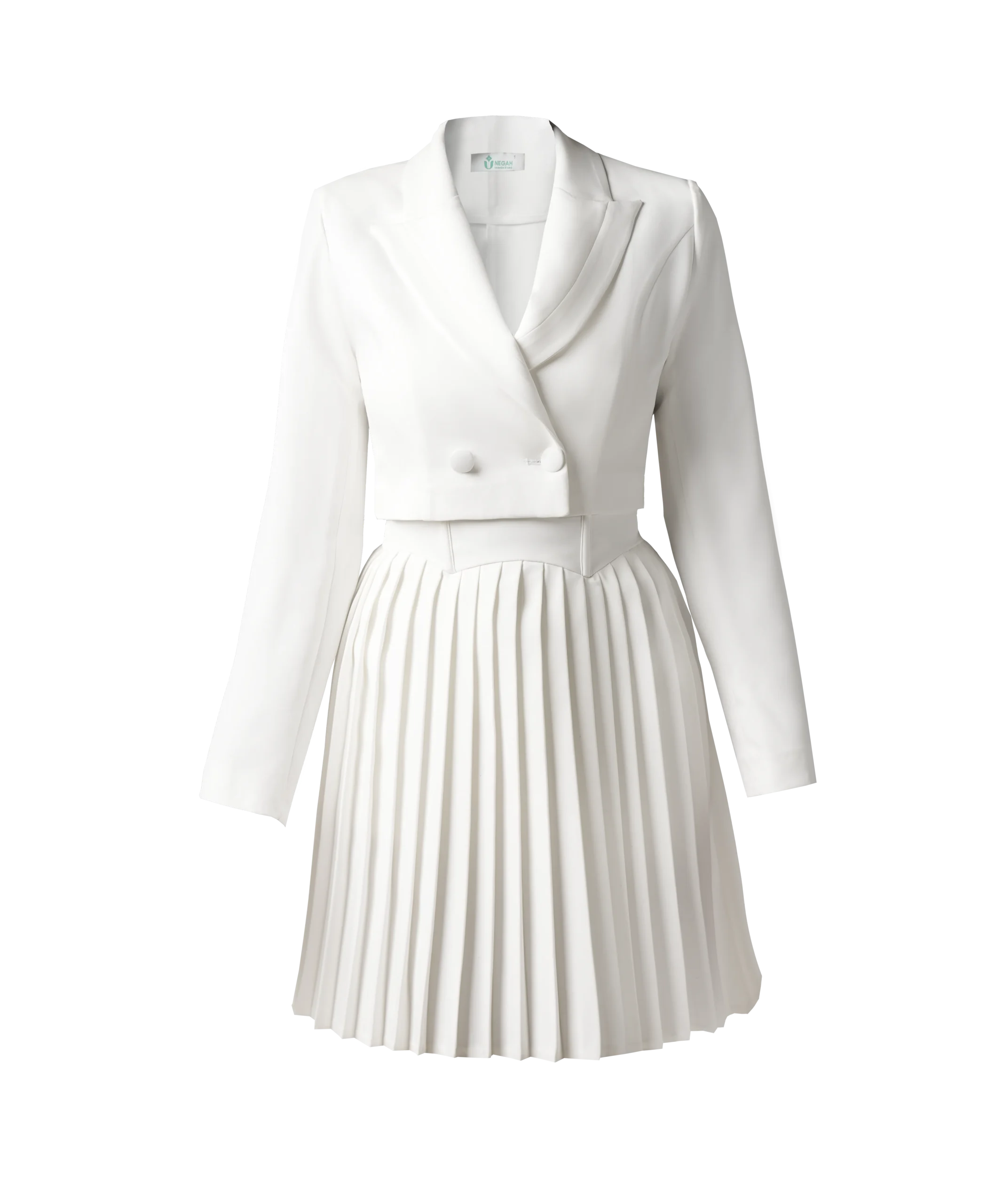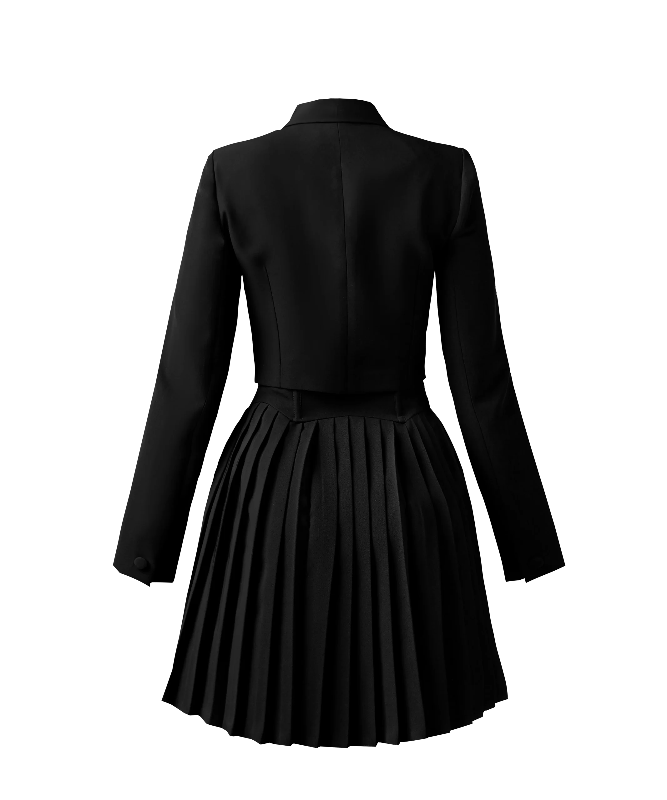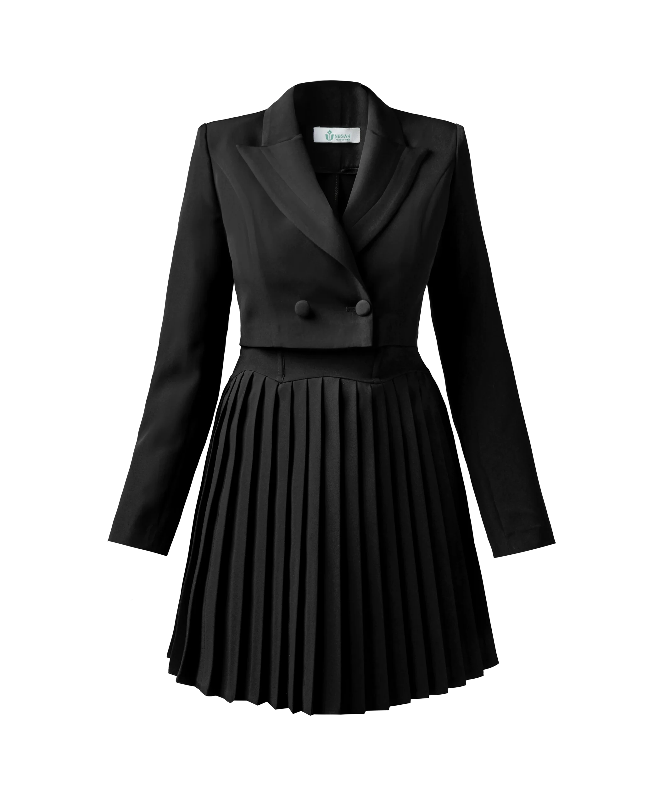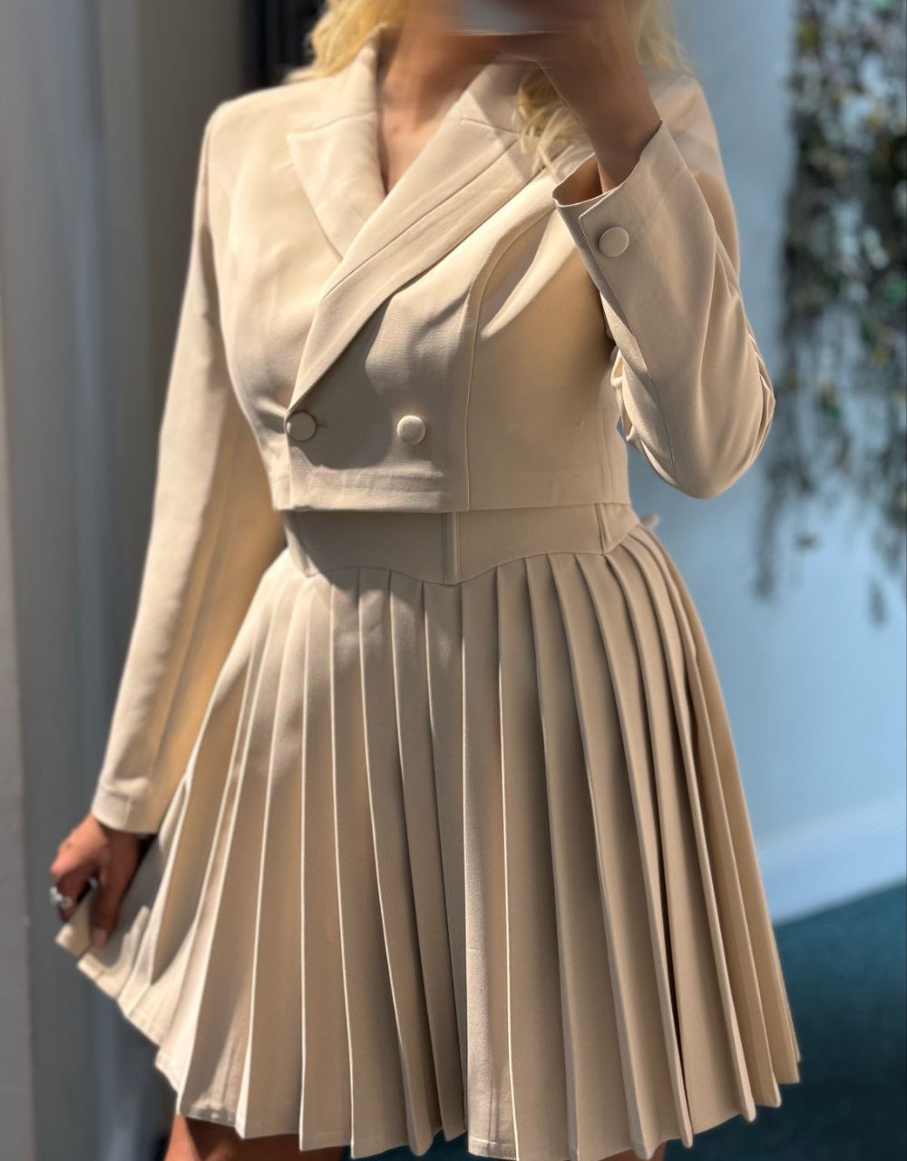 • دامن پلیسه و کت کوتاه: دامن پلیسه این ست، جلوه‌ای ظریف و زنانه به آن می‌بخشد و کت کوتاه نیز به شما کمک می‌کند تا اندامتان را متناسب‌تر نشان دهید.