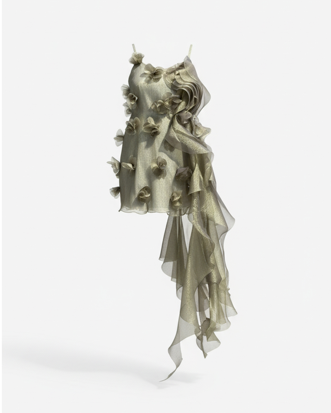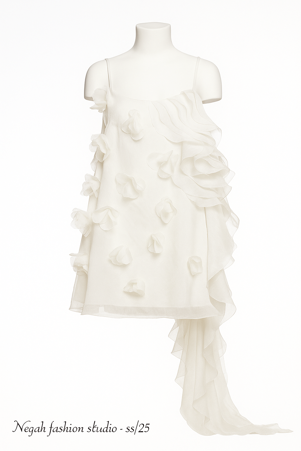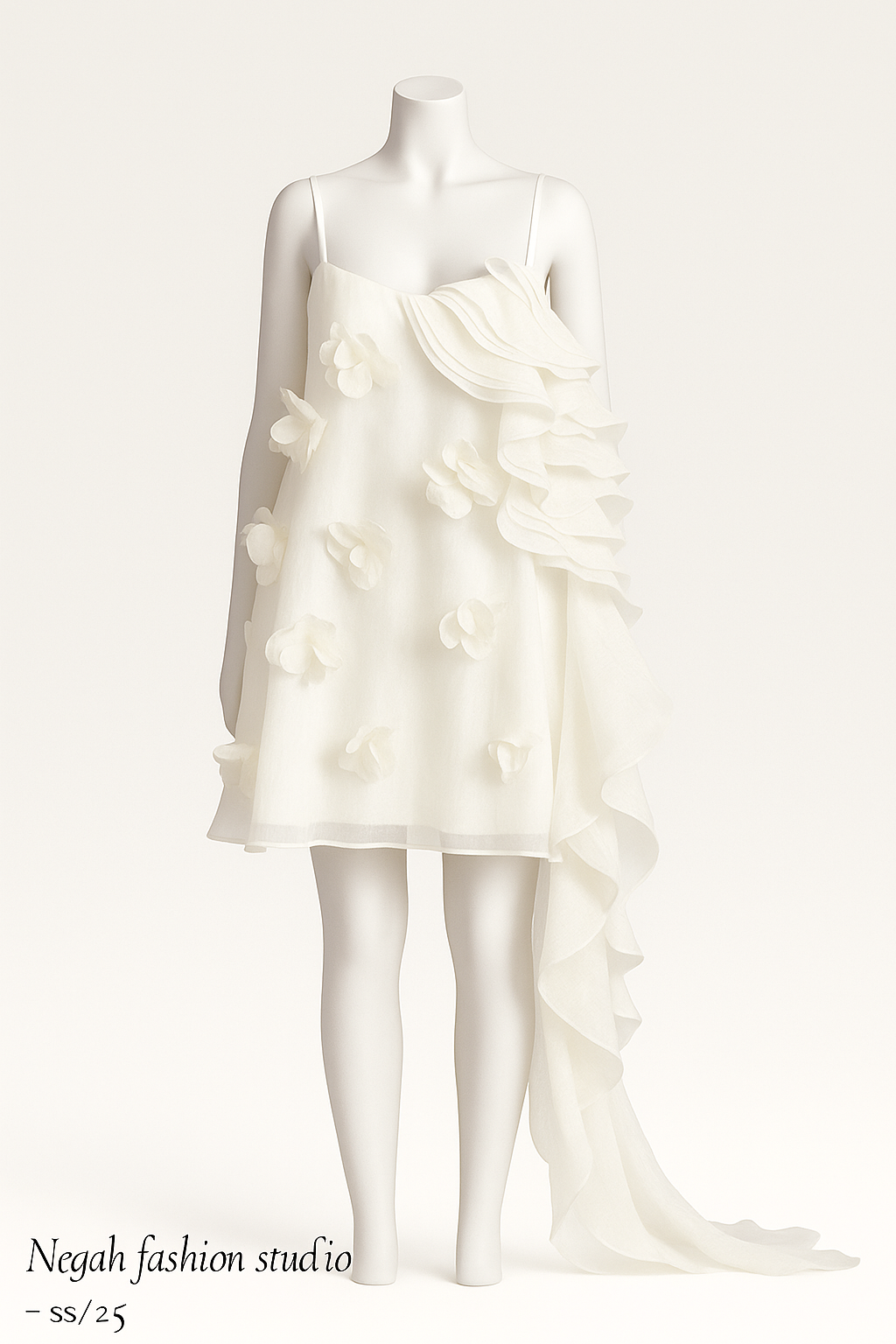 3. جزئیات هنرمندانه – گلهای سهبعدی و چینهای ظریف: بر روی پیراهن آنا، گلهای سهبعدی با ظرافت تمام دوخته شدهاند؛ این تزیینات خاص، لباس را از حالت ساده خارج کرده و جلوهای شاعرانه و رمانتیک به آن میبخشند. چینهای نرم و هنرمندانه در طراحی، به پیراهن حجم و بافتی دلپذیر میدهند که در حرکت، زیبایی آن را دوچندان میکند.