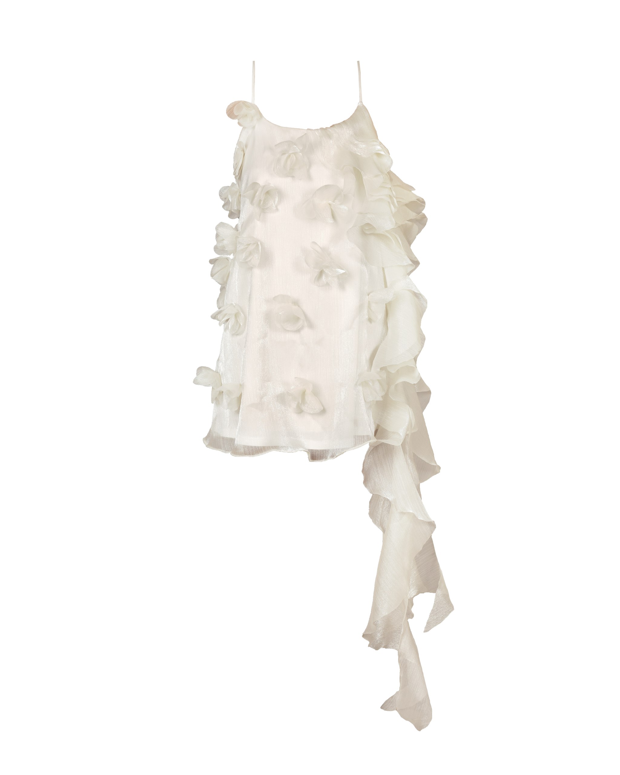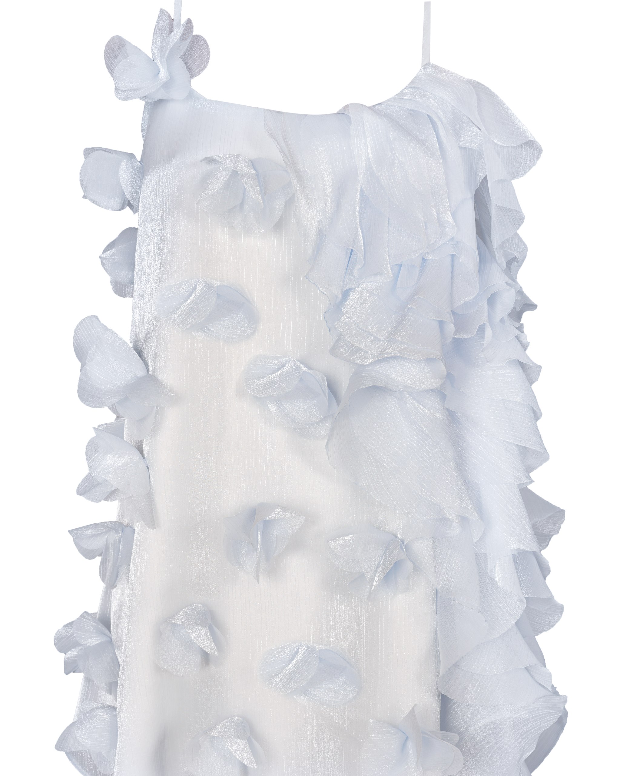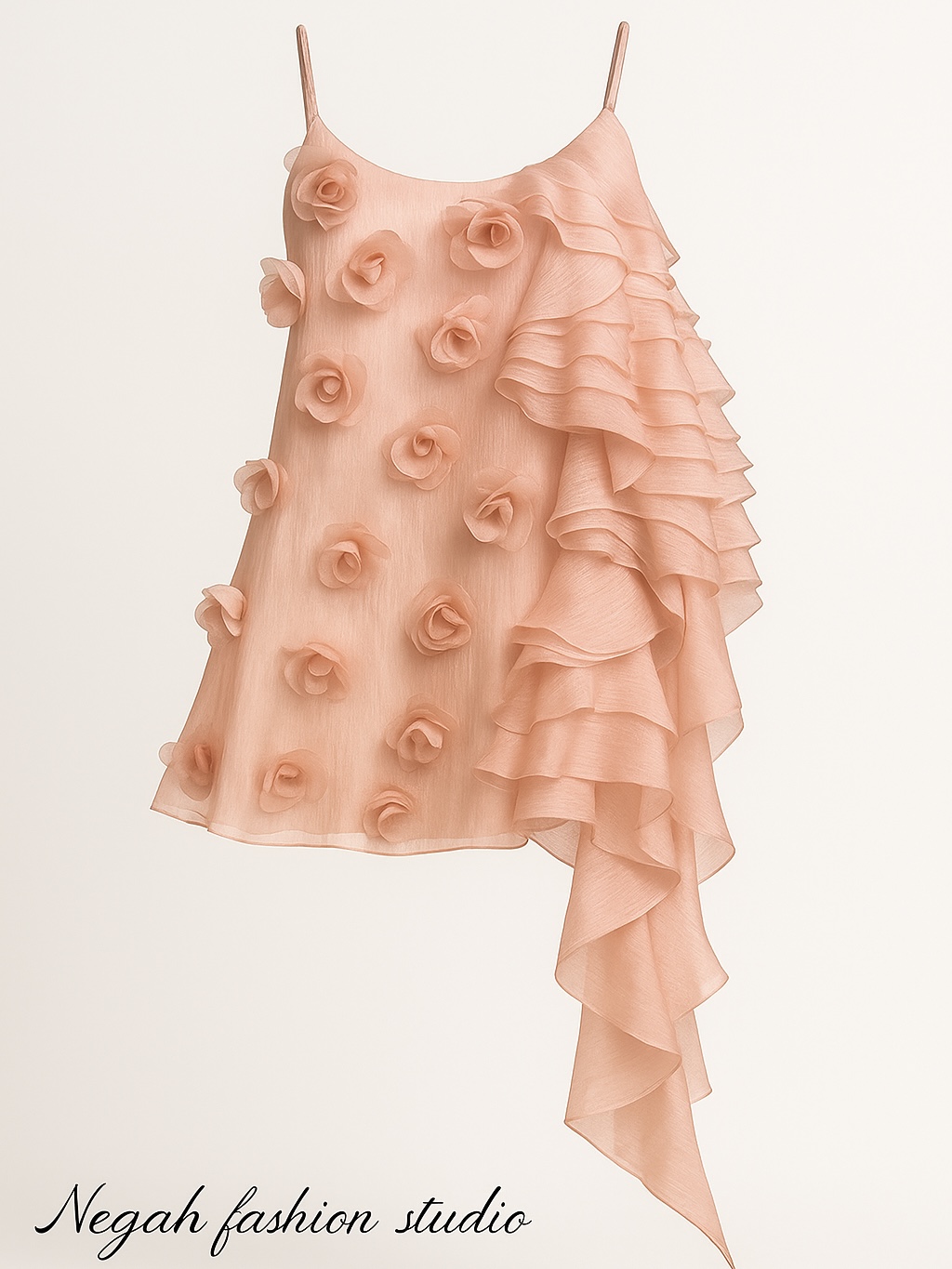 3. جزئیات هنرمندانه – گلهای سهبعدی و چینهای ظریف: بر روی پیراهن آنا، گلهای سهبعدی با ظرافت تمام دوخته شدهاند؛ این تزیینات خاص، لباس را از حالت ساده خارج کرده و جلوهای شاعرانه و رمانتیک به آن میبخشند. چینهای نرم و هنرمندانه در طراحی، به پیراهن حجم و بافتی دلپذیر میدهند که در حرکت، زیبایی آن را دوچندان میکند.
