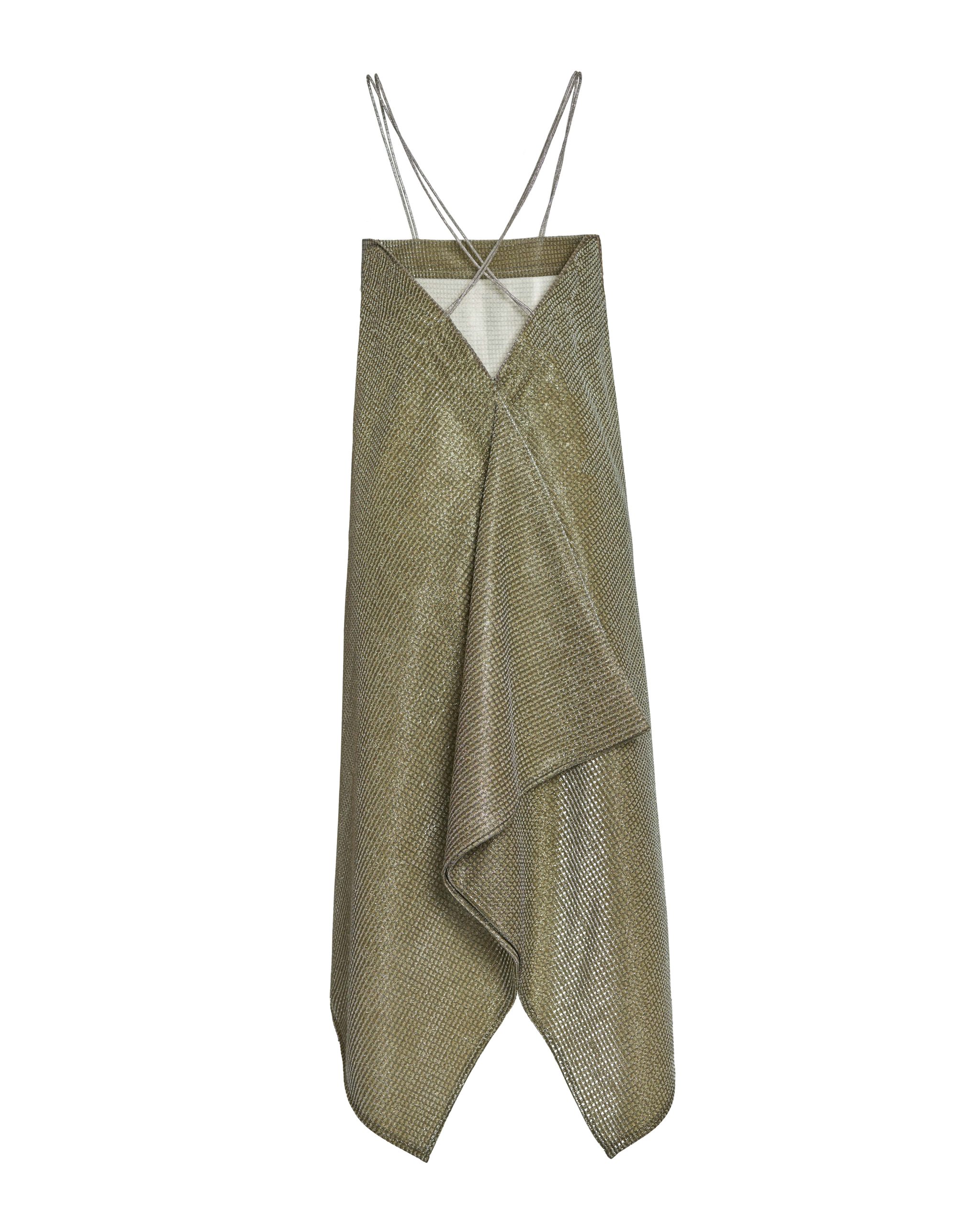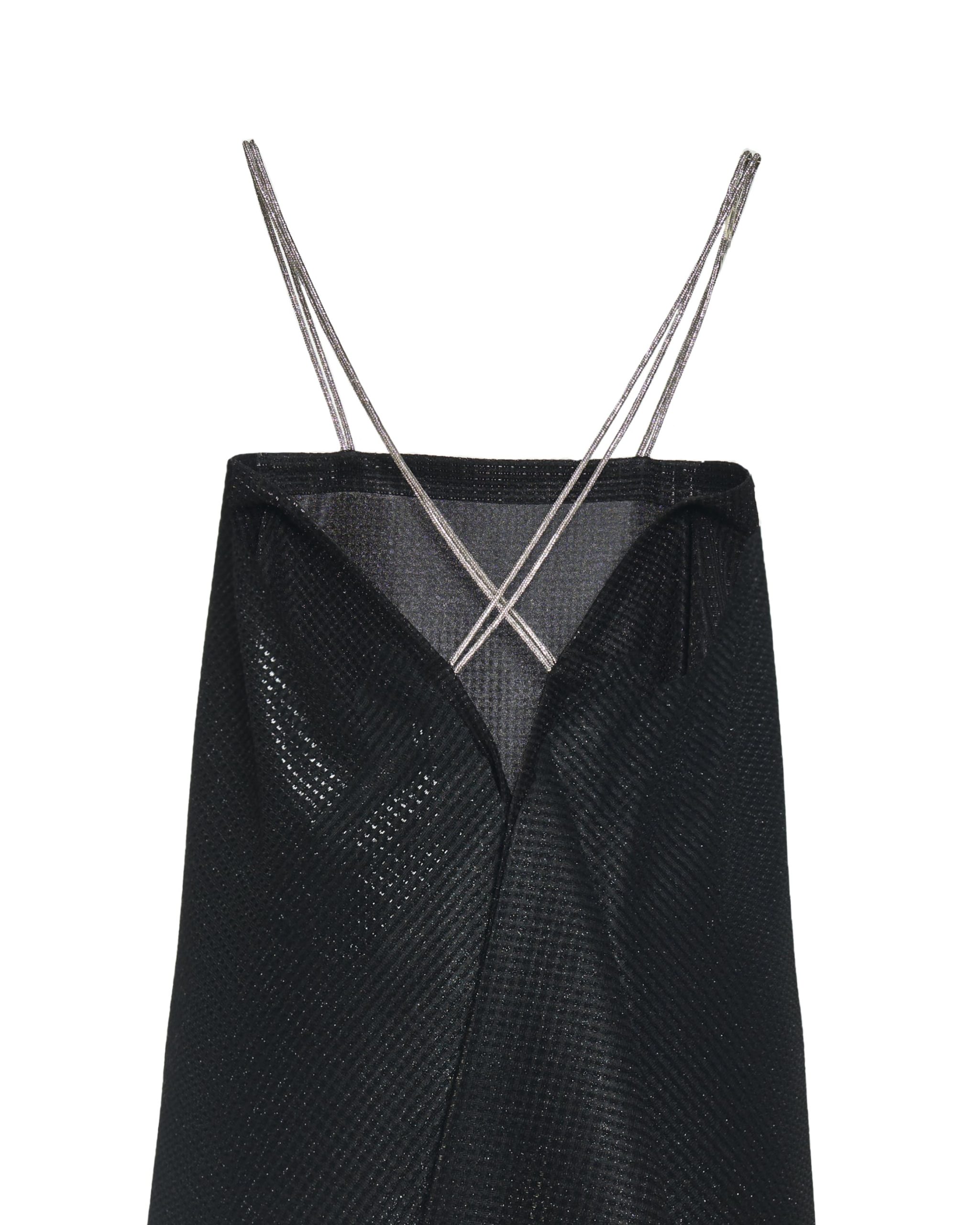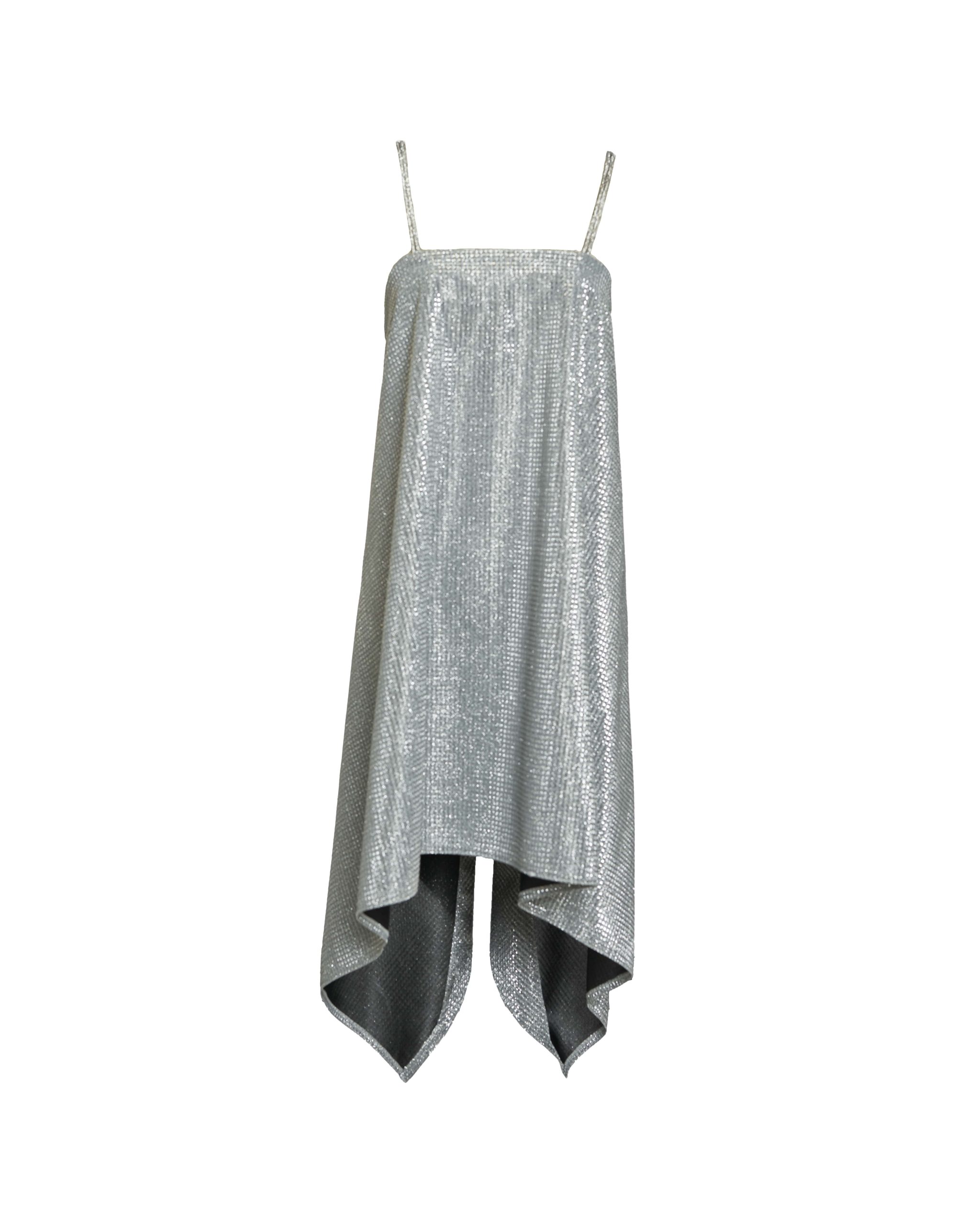 - جزئیات نقرهای: چهار بند نقرهای ضربدری شکل در پشت این لباس مجلسی، جزئیاتی منحصر به فرد به آن افزودهاند. این جزئیات نه تنها به زیبایی کلی لباس افزودهاند بلکه باعث شدهاند تا پیراهن رها یکی از لباسهای منحصر به فرد و دیدنی باشد.
