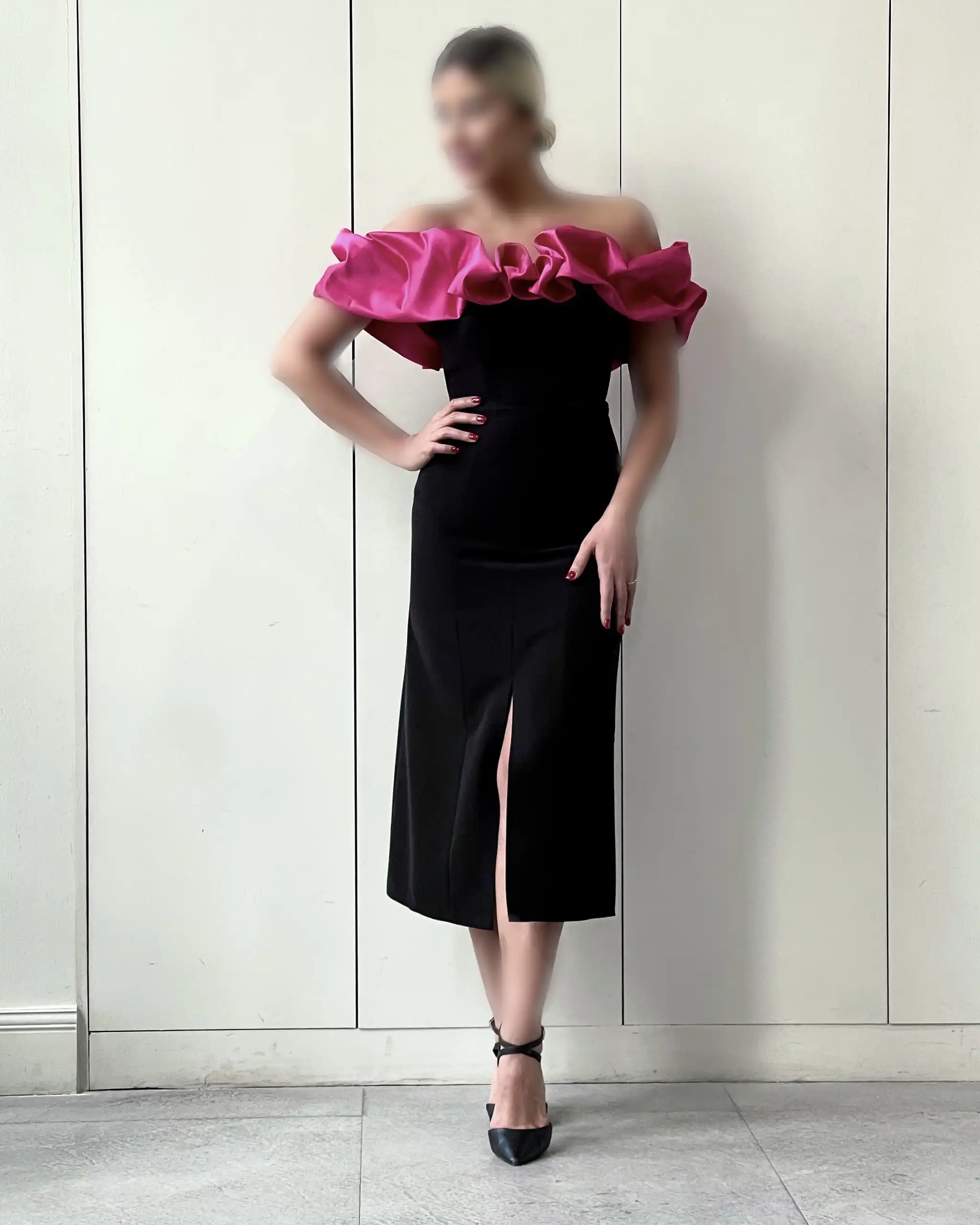 استفاده از پارچه ساتن و کرپ، یکی از ویژگی‌های مهم در دوخت پیراهن میدی آلاله است.