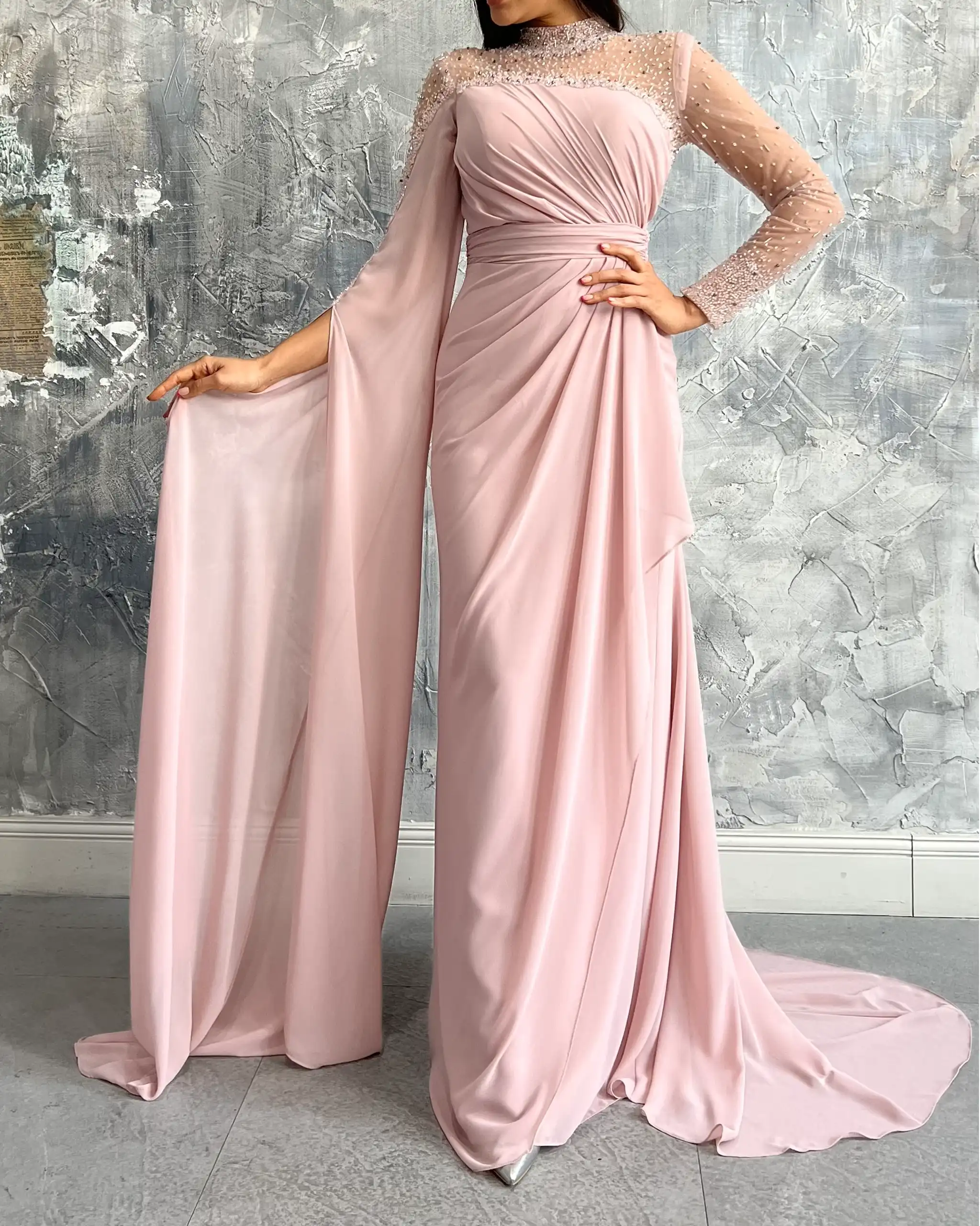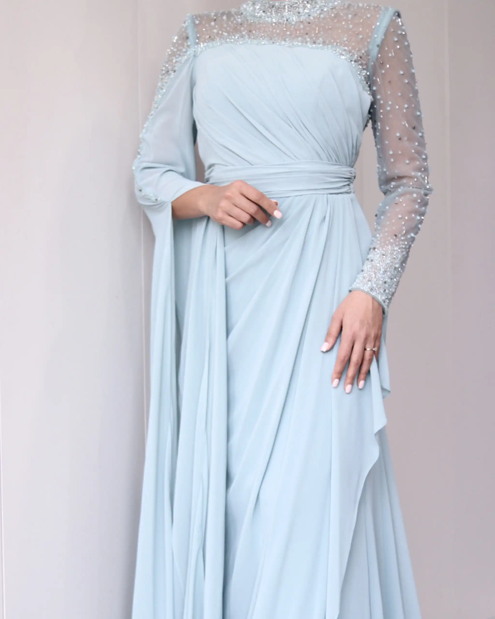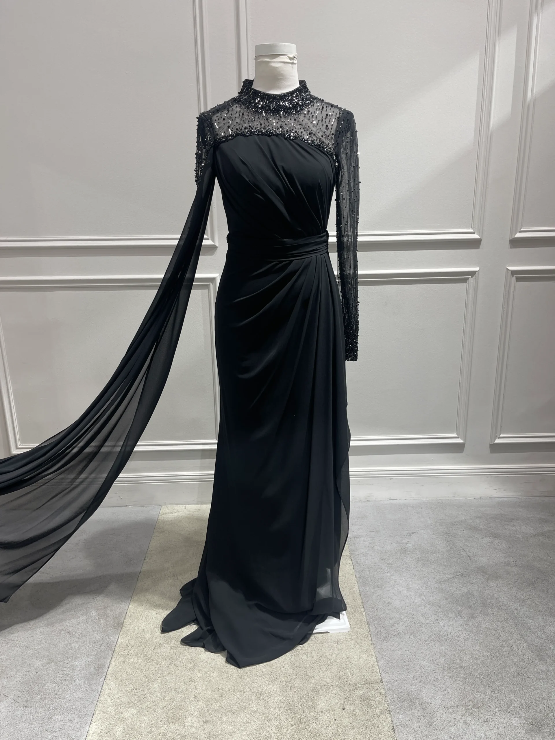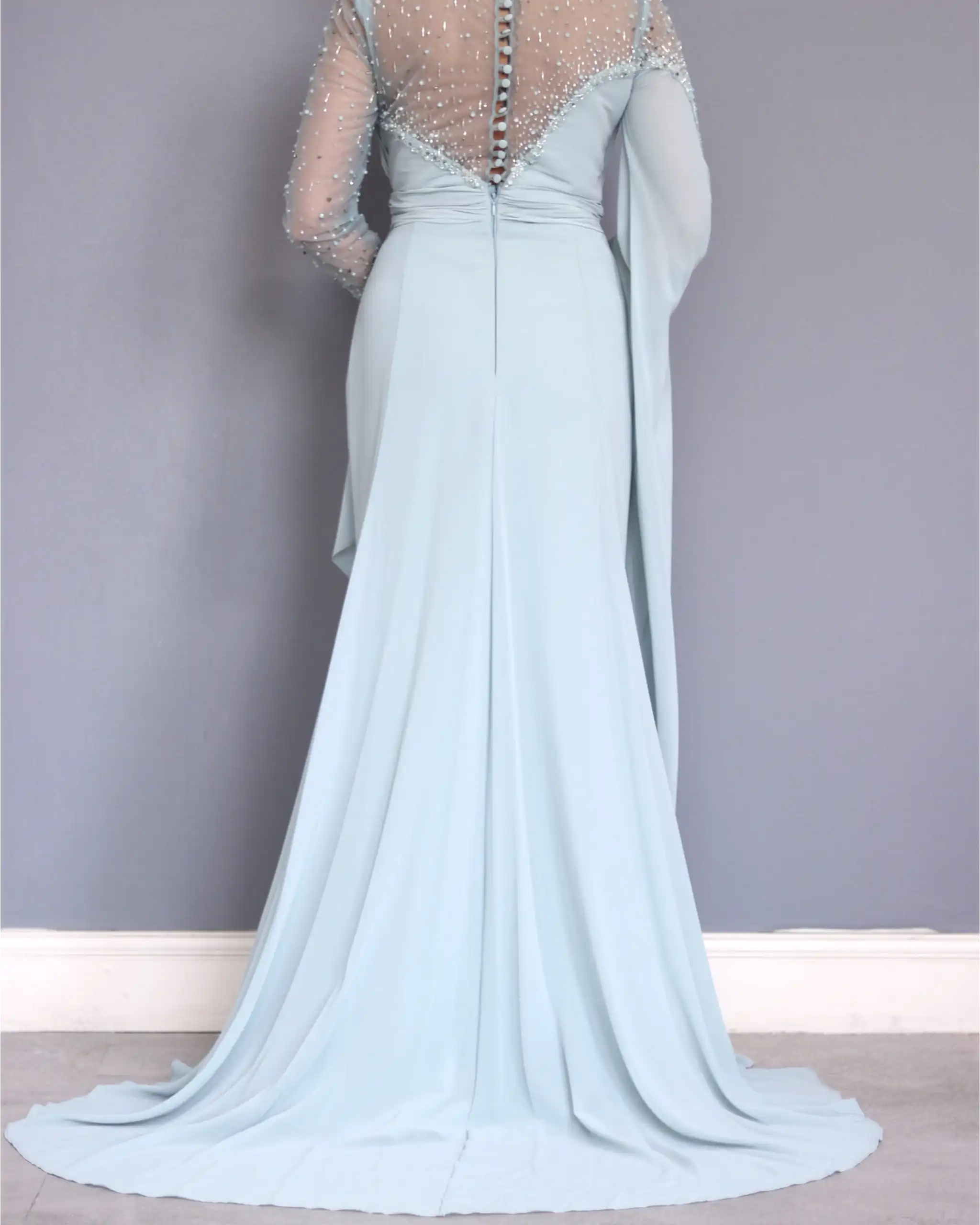 پیراهن مجلسی تمام پوشیده VIP دارای آستینهای بلند کارشده است که به خوبی دستها را پوشش میدهد.