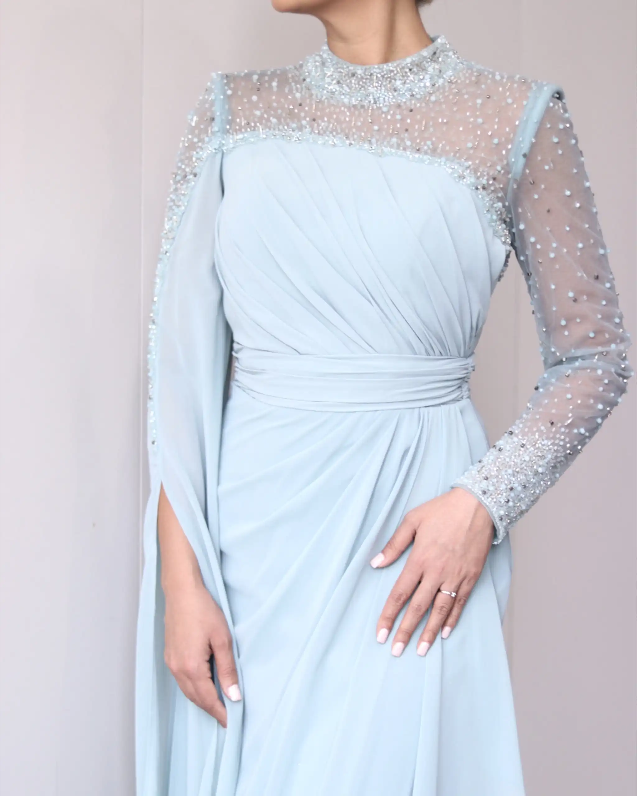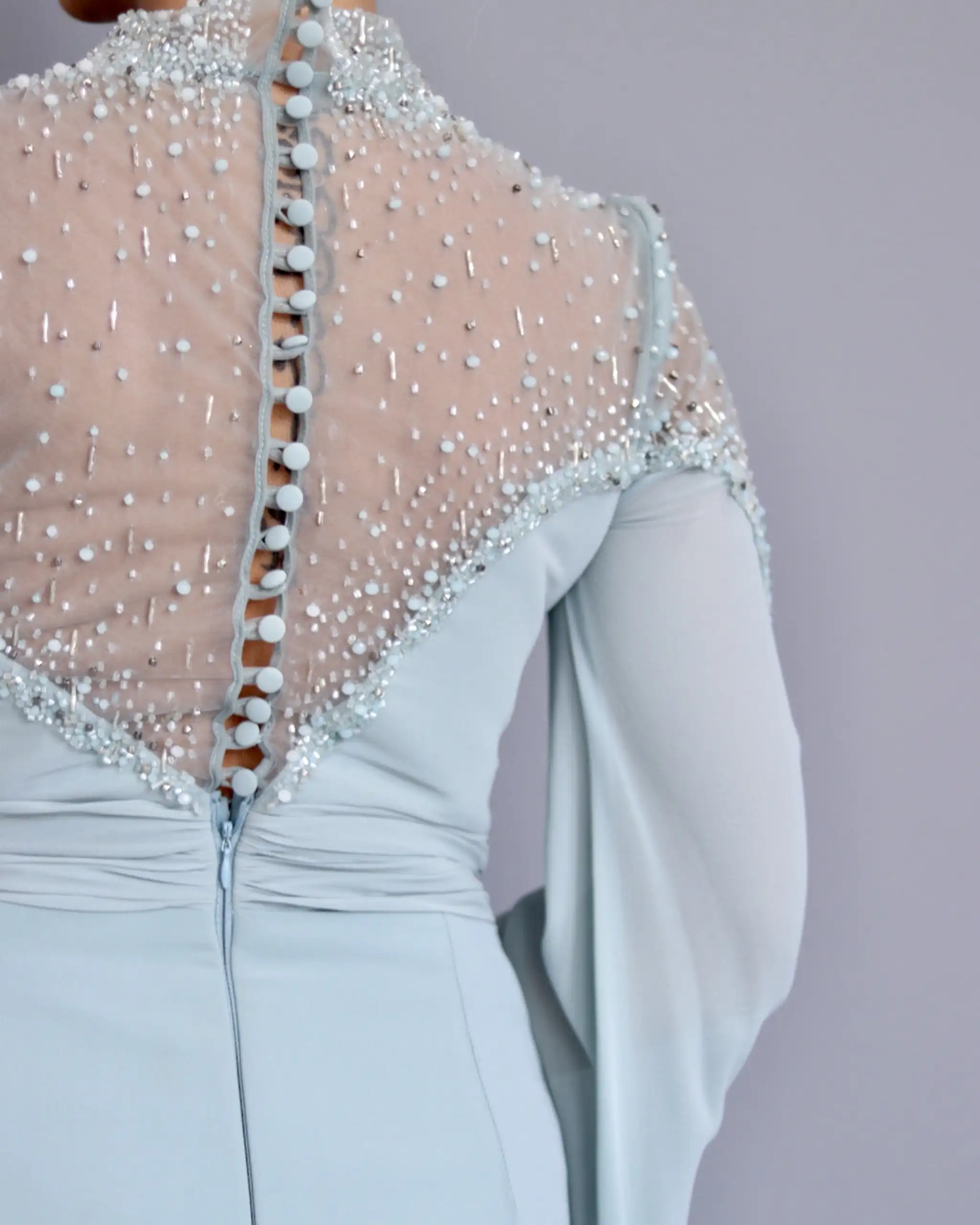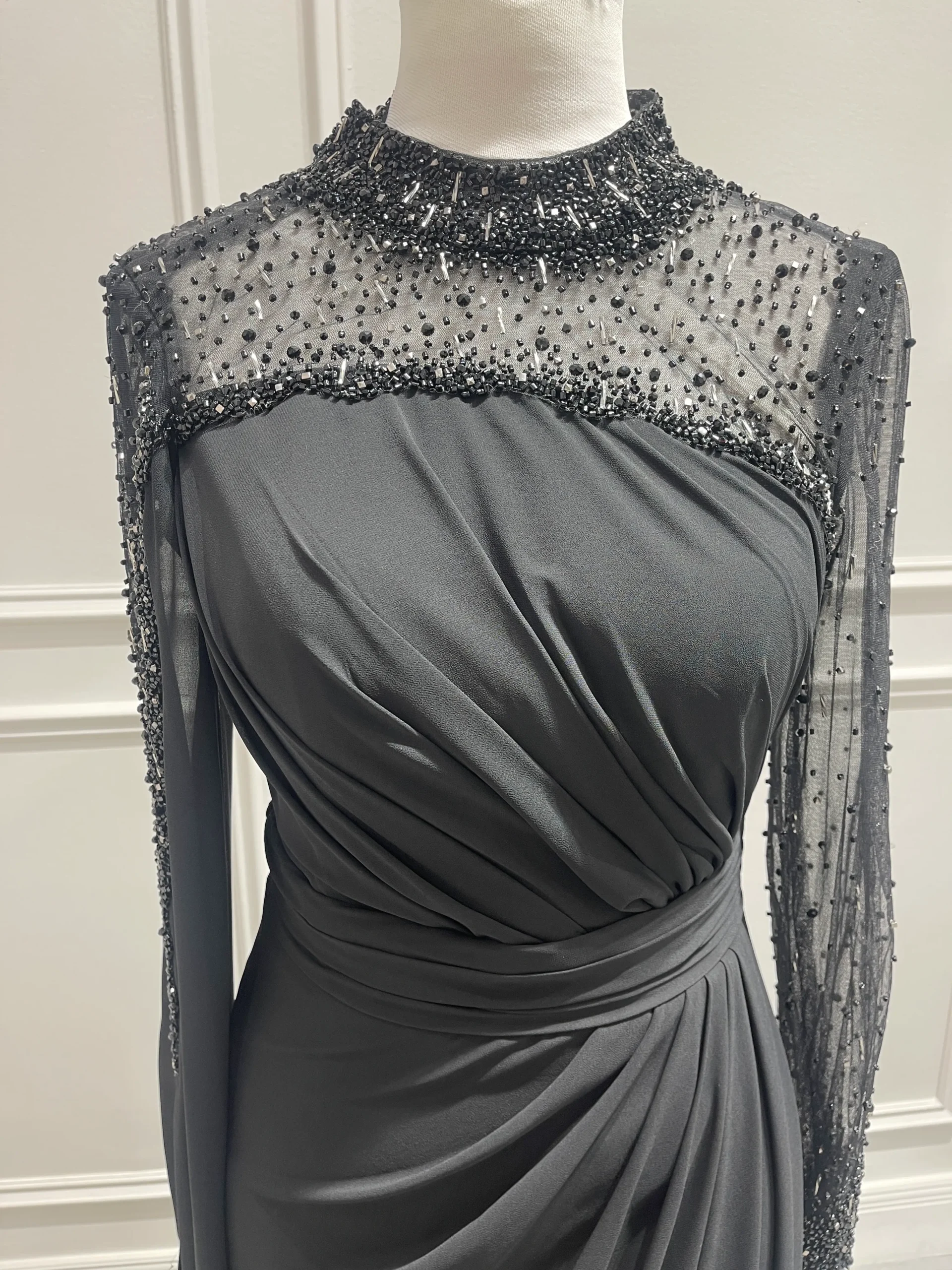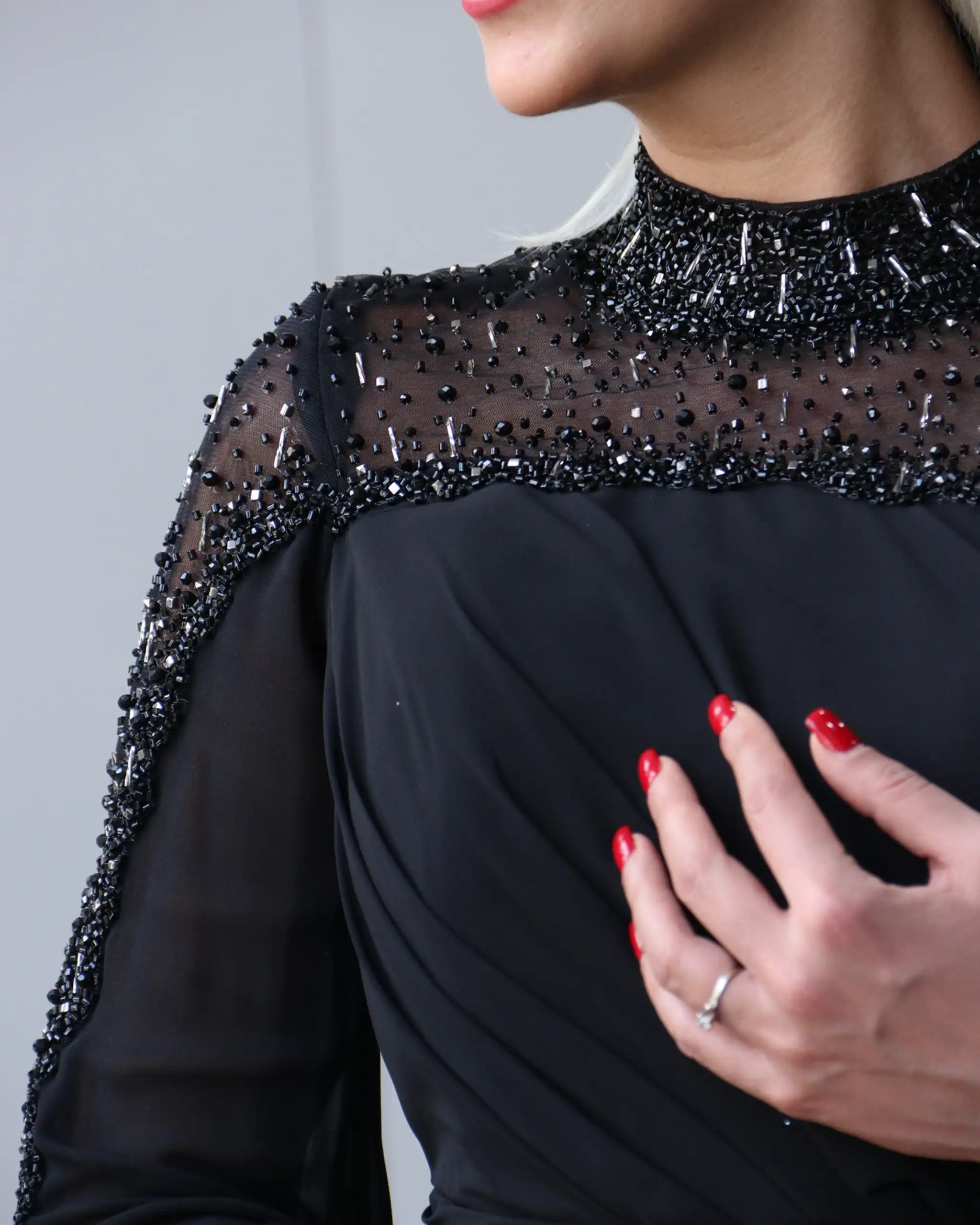 پیراهن VIP تماما پوشیده، دارای یقه بسته سنگدوزی شده است. این مدل یقه به دلیل جزئیات سنگدوزی شده بسیار درخشان است، بطوری که شما دیگر نیاز به اکسسوریهایی همچون گردنبند یا گوشواره ندارید.