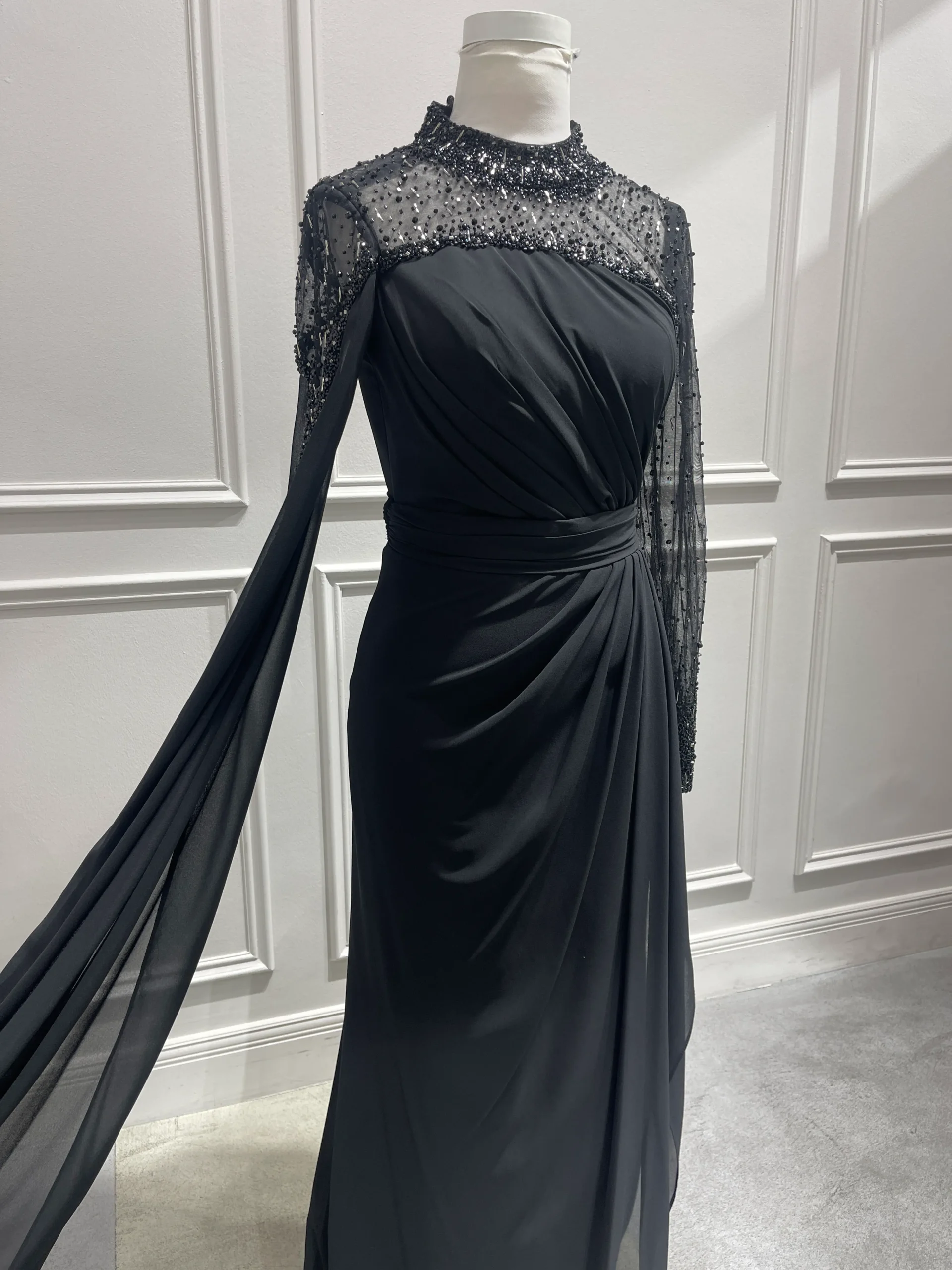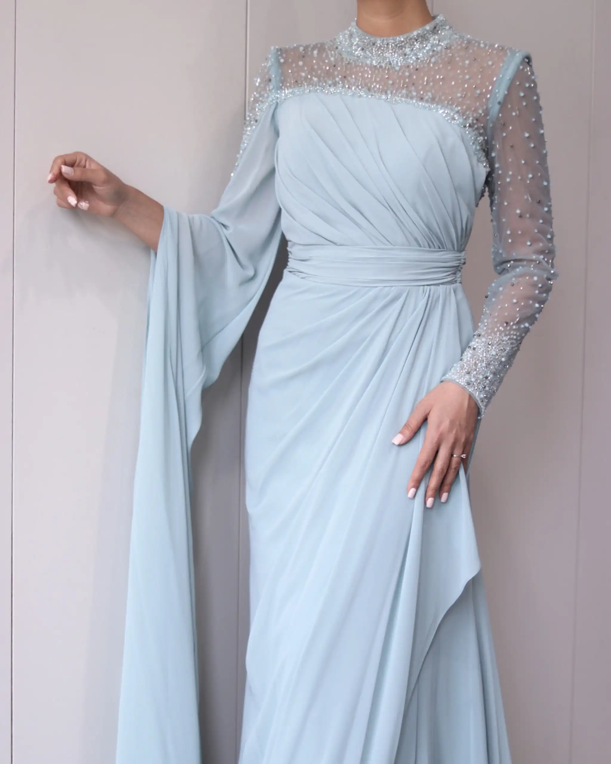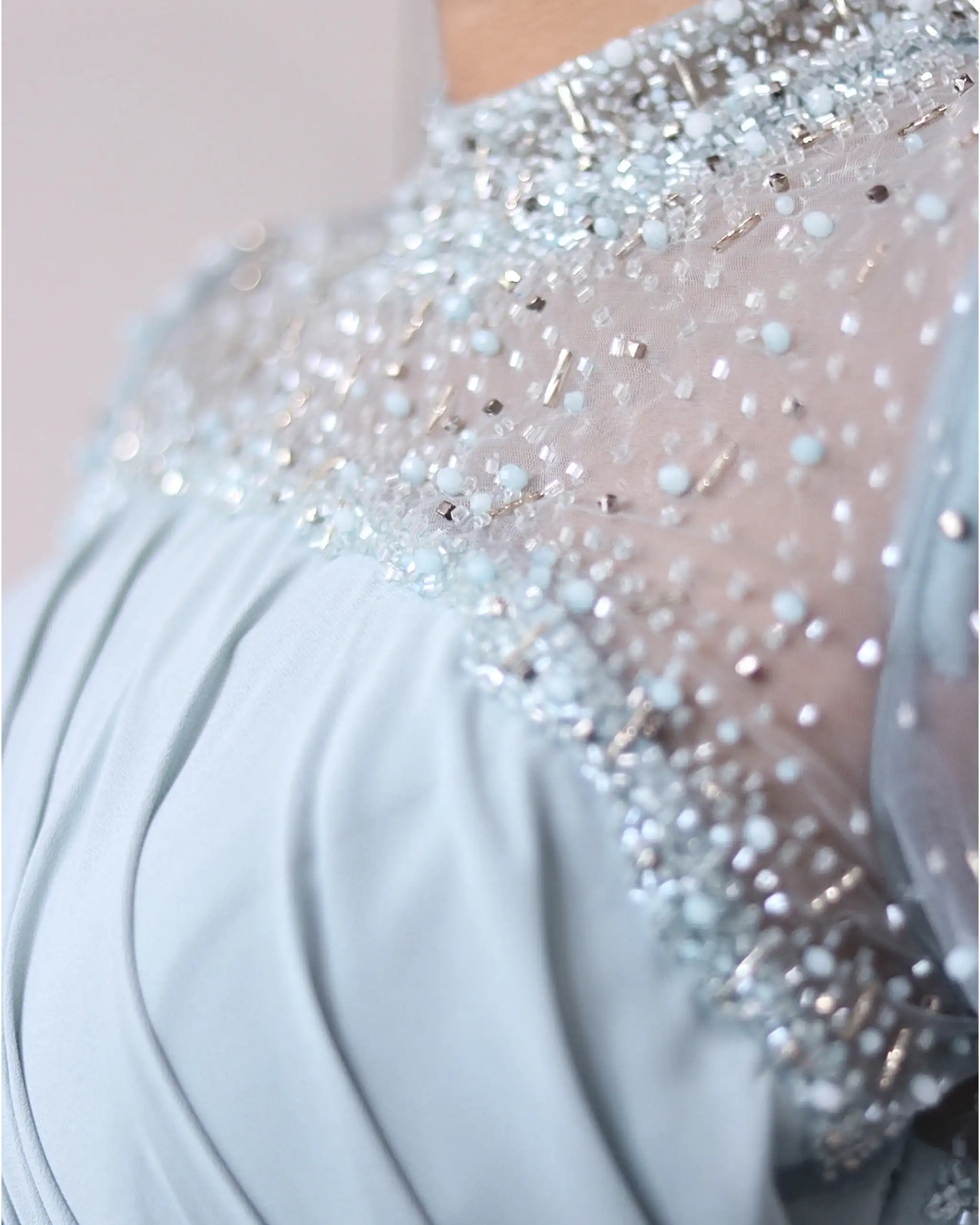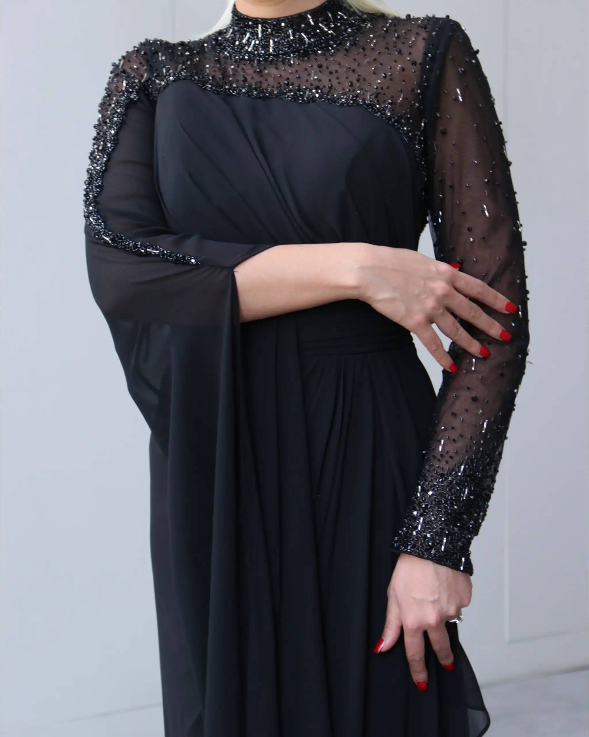 پیراهن VIP تماما پوشیده، دارای یقه بسته سنگدوزی شده است. این مدل یقه به دلیل جزئیات سنگدوزی شده بسیار درخشان است، بطوری که شما دیگر نیاز به اکسسوریهایی همچون گردنبند یا گوشواره ندارید.